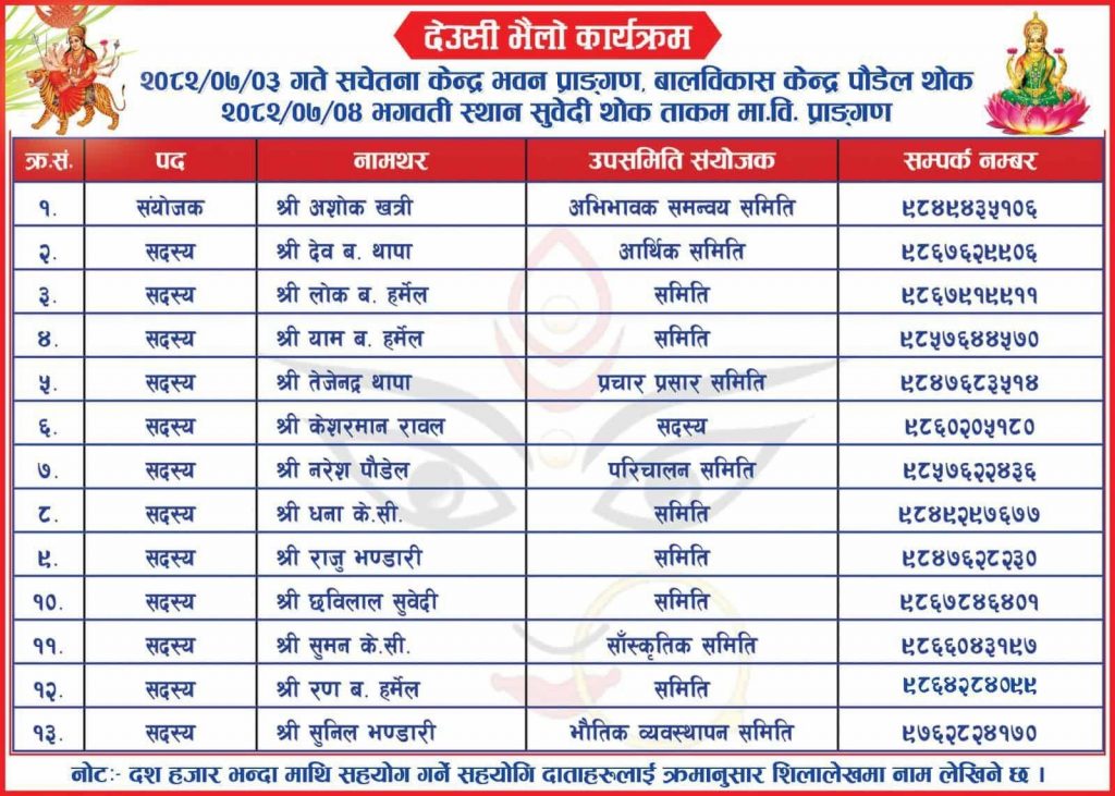 वडा अध्यक्ष समेत रहेका विद्यालय व्यवस्थापन समितिका अध्यक्ष अशोक खत्रीको नेतृत्वमा विभिन्न उपसमितिहरु गठन गरेर देउसीभैलो कार्यक्रमको तयारी गरिएको विद्यालयका प्रअ ई. केशरमान रावलले बताउनुभयो ।