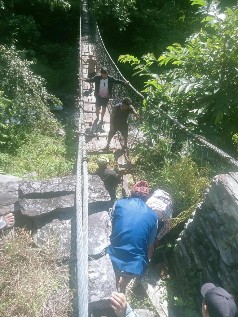 बेनी । म्याग्दीको बेनी नगरपालिका–४ र मङ्गला गाउँपालिका–३ को सिमाना अर्जेखोलामा रहेको झोलुङ्गे पुलको स्थानीयबासीले श्रमदानबाट मर्मत गरेका छन् ।