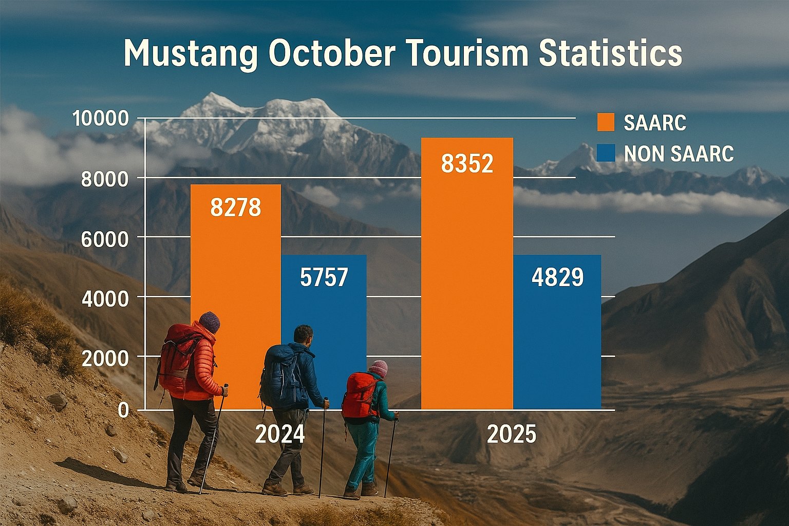 सन २०२४ को तुलनामा यस वर्षको अक्टोबरमा मुस्ताङ घुम्न आउने विदेशी पर्यटकको संख्या छ दशमलब शून्य आठ प्रतिशत अथवा आठ सय ५४ जना कम हो । सन २०२४ को अक्टोबरमा १४ हजार ३५ जनाले मुस्ताङ भ्रमण गरेका थिए । अक्टोबरलाई पर्यटकको पिक सिजन मानिन्छ ।
