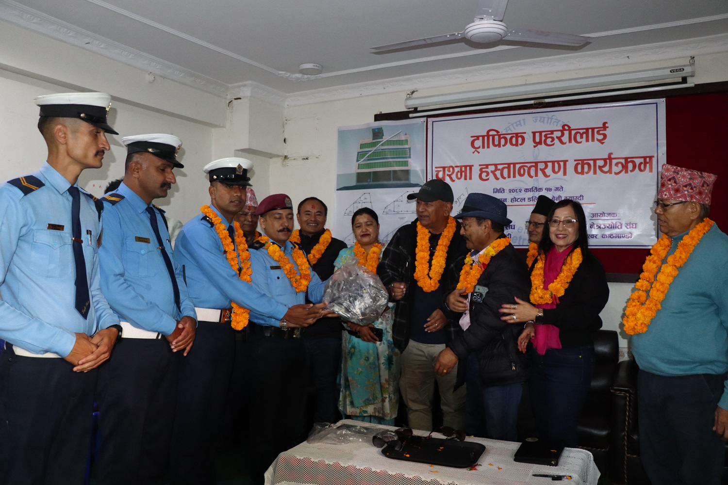 ड्युटीमा खटिने प्रहरीको सहजताको लागि संघले ५० थान चश्मा उपलब्ध गराएको हो । अमेरिकामा बस्ने नारायण श्रेष्ठले चस्मा सहयोग गर्नुभएको हो ।