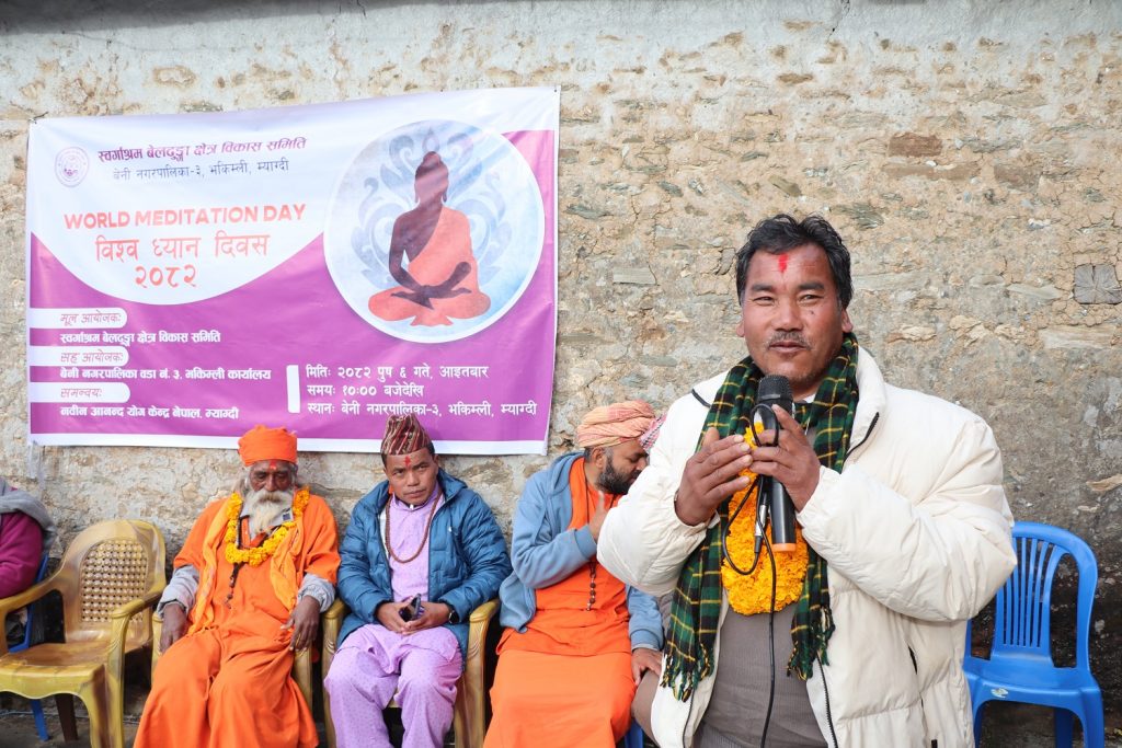बेनी नगरपालिका वडा नं. ३ को कार्यालयको सहयोगमा नविन आनन्द योग केन्द्र नेपाल र स्वर्गाश्रम क्षेत्र विकास समितिको आयोजनामा समुन्द्रि सतहदेखि दुई हजार पाँच सय मिटर उचाईमा रहेको स्वर्गाश्रममा ध्यान दिवस मनाइएको हो ।