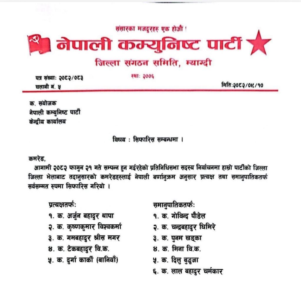 नेपाली कम्युनिष्ट पार्टी म्याग्दीद्धारा उमेद्वारको नाम सिफारिस