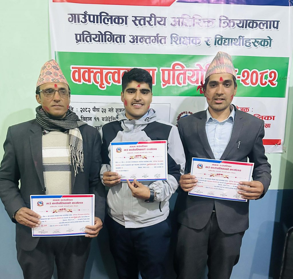मंगला माविका भिमप्रसाद शर्मा दोस्रो र दिपशिखा मावि कुहुँका बाबुराम खत्री तेस्रो हुनुभयो । विद्यार्थी जिवनदेखि राष्ट्रिय जिम्मेवारीसम्म विषयक वक्तृत्वकलामा दिपशिखा मावि कहुँका स्नेहा थापा प्रथम भएको गाउँपालिकाका शिक्षा अधिकृत गणेशबहादुर कटुवाल क्षेत्रीले जानकारी दिनुभयो ।