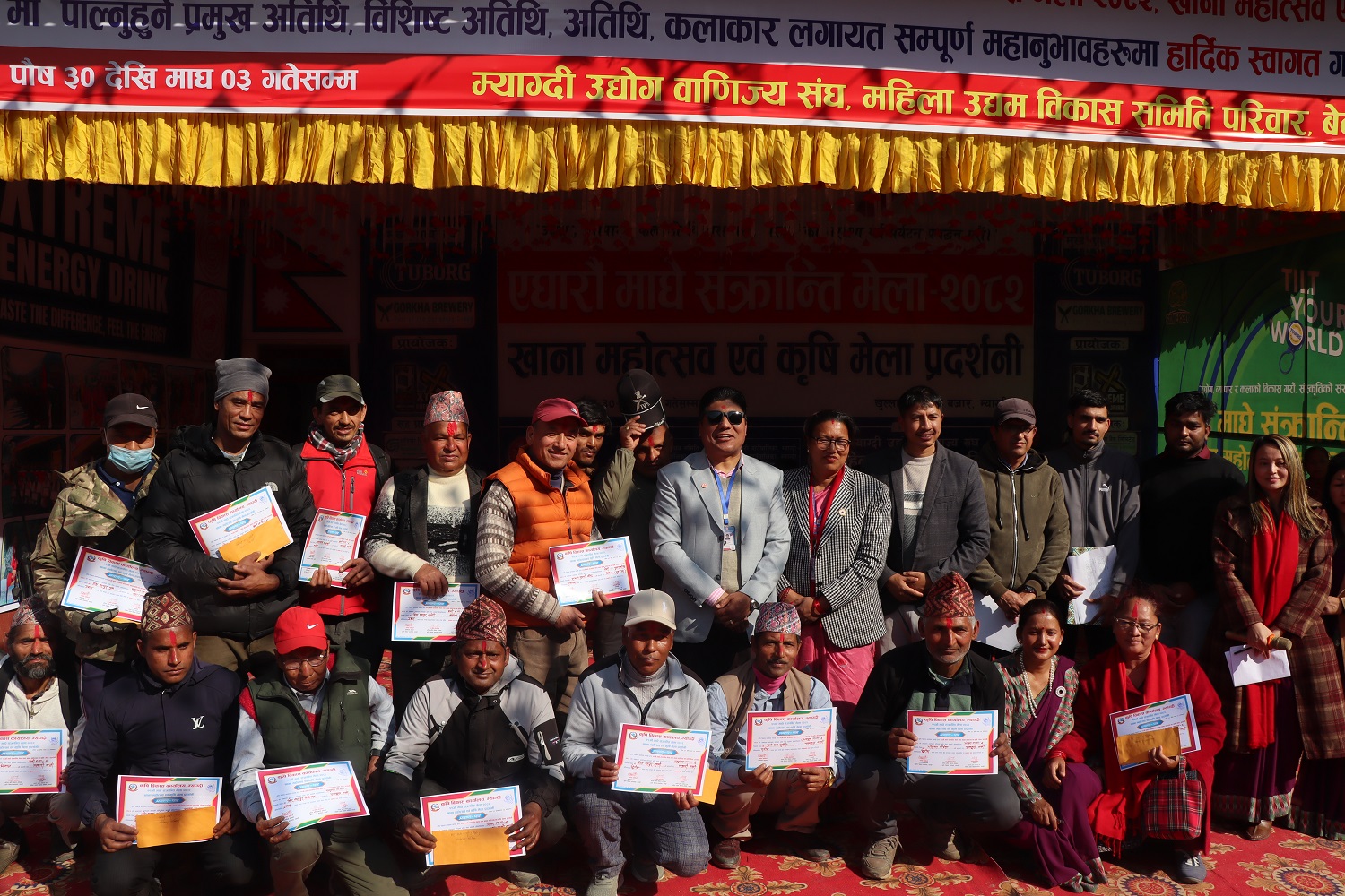 बेनीमा माघे संक्रान्ति पर्वको अवसरमा कृषि विकास कार्यालय र म्याग्दी उद्योग वाणिज्य संघ अन्तर्गतको महिला उद्यम विकास समितिले आयोजना गरेको कृषि मेला प्रर्दशनीमा पहिलो, दोस्रो, तेस्रो र सान्तवना हुने किसानहरुलाई पुरस्कृत गरिएको हो ।