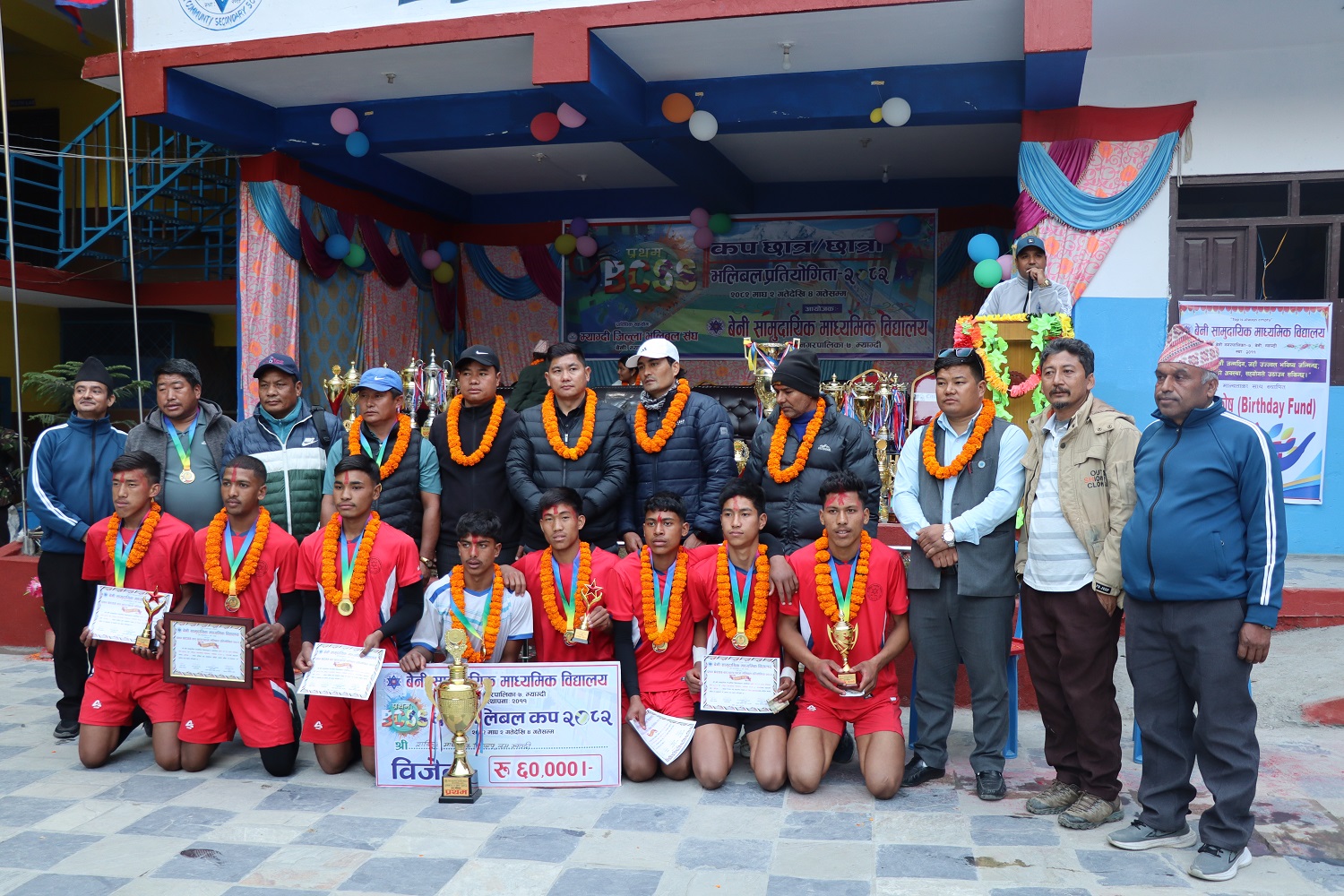बिजयी खेलाडीहरुलाई गण्डकी प्रदेशसभा सदस्य रशेमबहादुर जुग्जाली, बेनी सामुदायिक माविको ब्यवस्थापन समितिका अध्यक्ष समेत रहेका बेनपा–७ का वडा अध्यक्ष रमेशकुमार श्रेष्ठ, मालिका गाउँपालिका–२ का वडा अध्यक्ष उदयकुमार बुढाथोकी, प्रअ घर्ती, जिल्ला भलिबल संघका अध्यक्ष तेजेन्द्र बानियाले पुरस्कार वितरण गर्नुभएको थियो ।