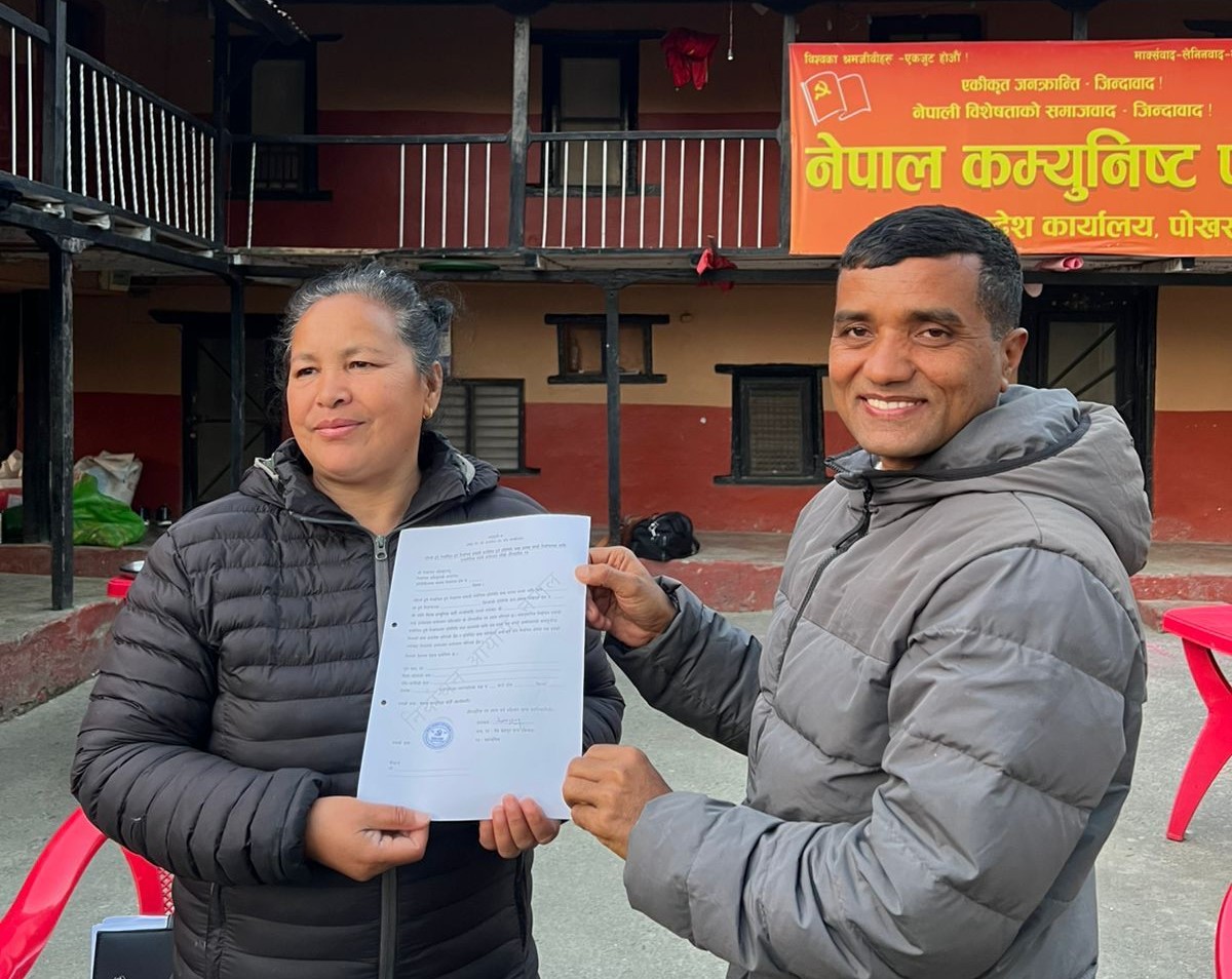 पोलिटब्युरो सदस्य तथा म्याग्दी जिल्ला ईञ्चार्ज घिमिरेलाई आइतबार पोखरामा नेकपा माओवादीका नेताहरुले टिकट हस्तान्तरण गर्नुभयो । बेनी नगरपालिका–२ बगरफाँटका घिमिरे म्याग्दी बहुमुखी क्याम्पसको पुर्व स्ववीयु सभापति हुनुहुन्छ ।