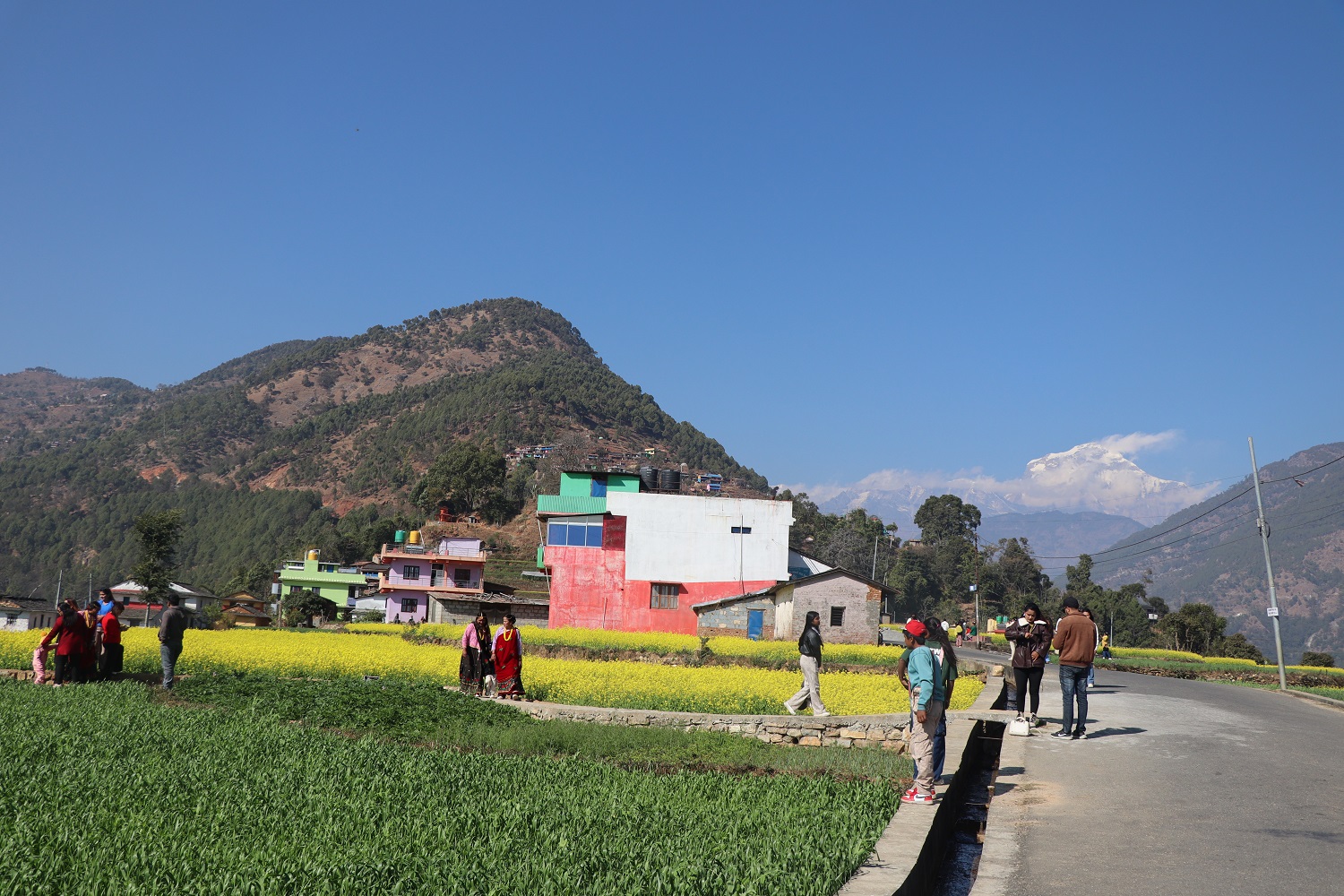 उत्तरतिर हेर्दा चाँदीझैँ टल्किने सेता हिमशृङ्खला । पूर्वतर्फ मोहोडा भएको समथर फाँटमा पहेँलै भएर फुलिरहेको तोरी र फाँटको बीचमा चिटिक्क परेको कालोपत्र सडकमा रमाउन पर्यटक आउने गरेका हुन् ।