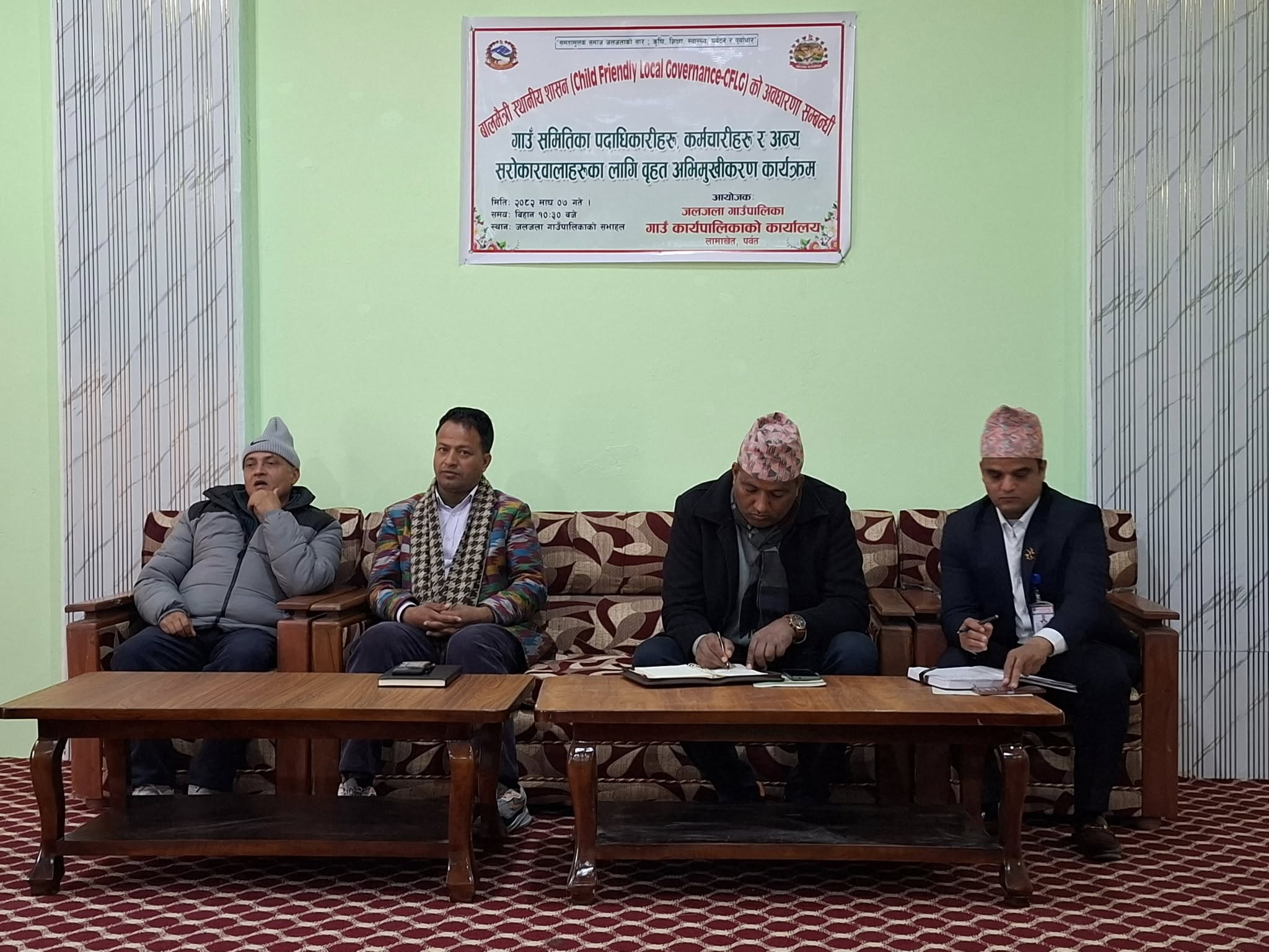 गाउँपालिकाले लामाखेतमा आयोजना गरेको बालमैत्री स्थानीय शासन सम्बन्धी बृहत अभिमुखीकरण कार्यक्रममा सहभागी गाउँपालिकाका अध्यक्ष राजुप्रसाद आचार्य, उपाध्यक्ष दिपक आचार्य, प्रमुख प्रशासकीय अधिकृत खगराज गौतम, वडा अध्यक्ष, कार्यपालिका सदस्य र सरोकारवालाहरुले प्रतिवद्धतापत्रमा हस्ताक्षर गर्नुभएको हो ।