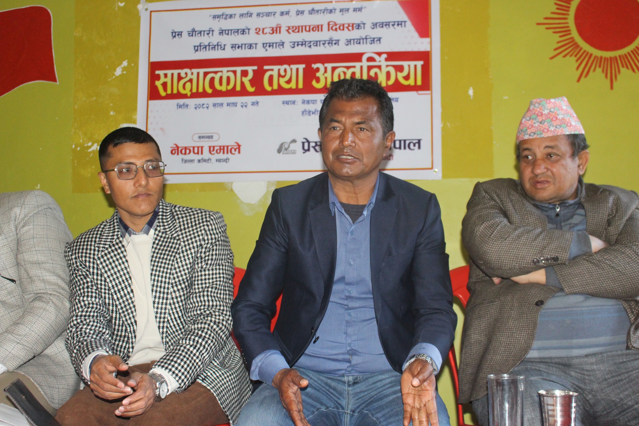 प्रेस चौतारी नेपाल म्याग्दीले २८ औ स्थापना दिवसको अवसरमा बिहिबार बेनीमा आयोजना गरेको उमेद्वारसँग अन्तरक्रिया कार्यक्रममा उमेद्वार श्रेष्ठले जनताको पक्षमका कानुन निर्माण र संसोधनमा आफ्नो मुख्य भूमिका केन्द्रित हुने बताउनुभयो ।