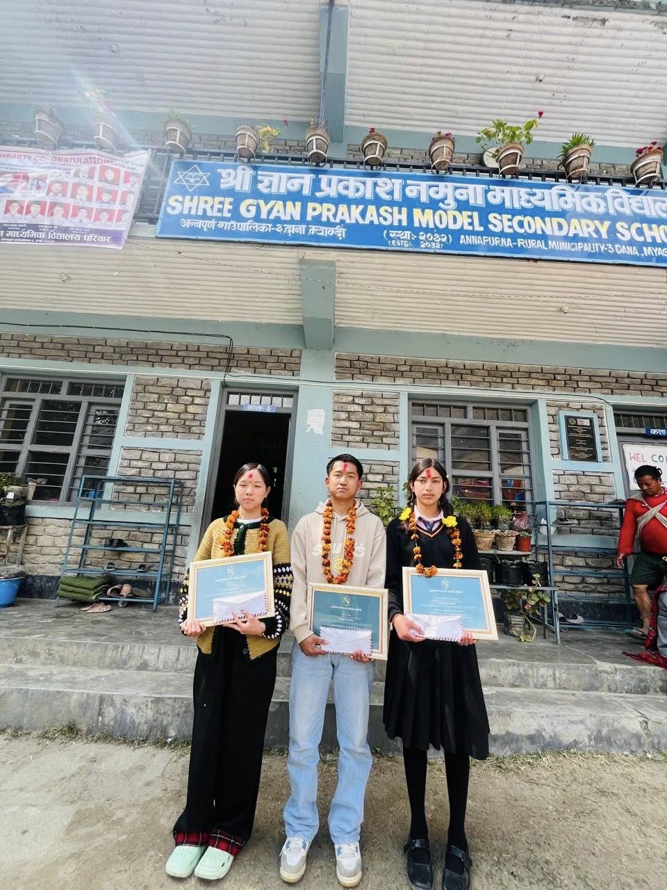 गत वर्षको एसइईमा विद्यालय प्रथम हुन अप्सन पूर्जालाई रु. ८० हजार र कक्षा ८ मा प्रथम हुने प्रतिज्ञा घर्तीले रु. ५० हजार नगद पुरस्कार प्राप्त गर्नुभएको छ । अन्नपूर्ण गाउँपालिकाका अध्यक्ष भारतकुमार पुन, उपाध्यक्ष दिवाकुमारी पुन, प्रमुख प्रशासकीय अधिकृत कपिलप्रसाद पाण्डे, आरोही पूर्जाका दाई कमलबहादुर पूर्जाले पुरस्कार वितरण गर्नुभएको थियो ।