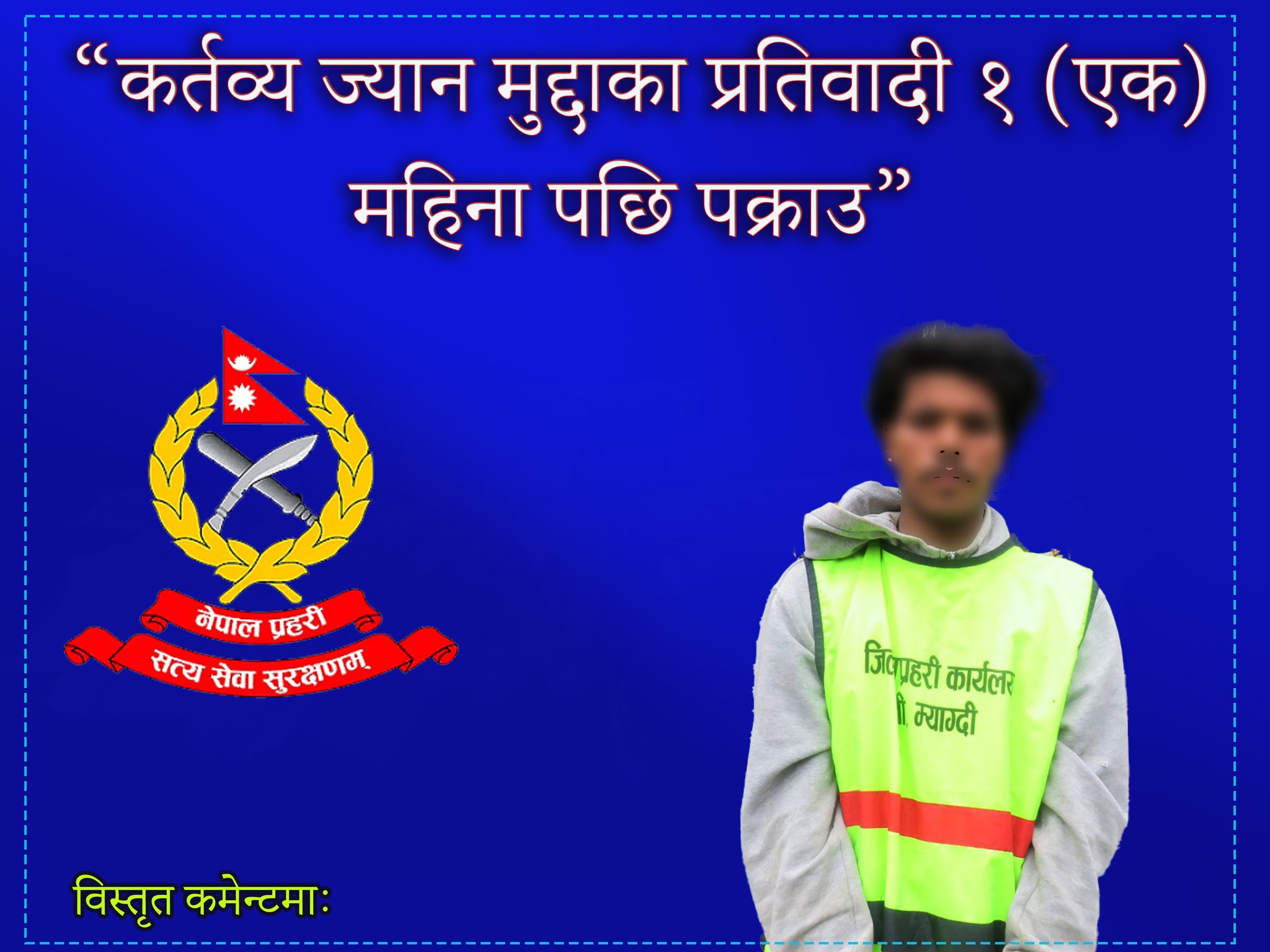 ज्यान सम्बन्धी कसुर (कर्तव्य ज्यान) मुद्दा शिर्षकमा म्याग्दी जिल्लाबाट सात दिनको म्याद थप गरेर अनुसन्धानका लागि प्रकाशलाई हिरासतमा राखिएको प्रहरी निरीक्षक तिमिल्सीनाले बताउनुभयो ।