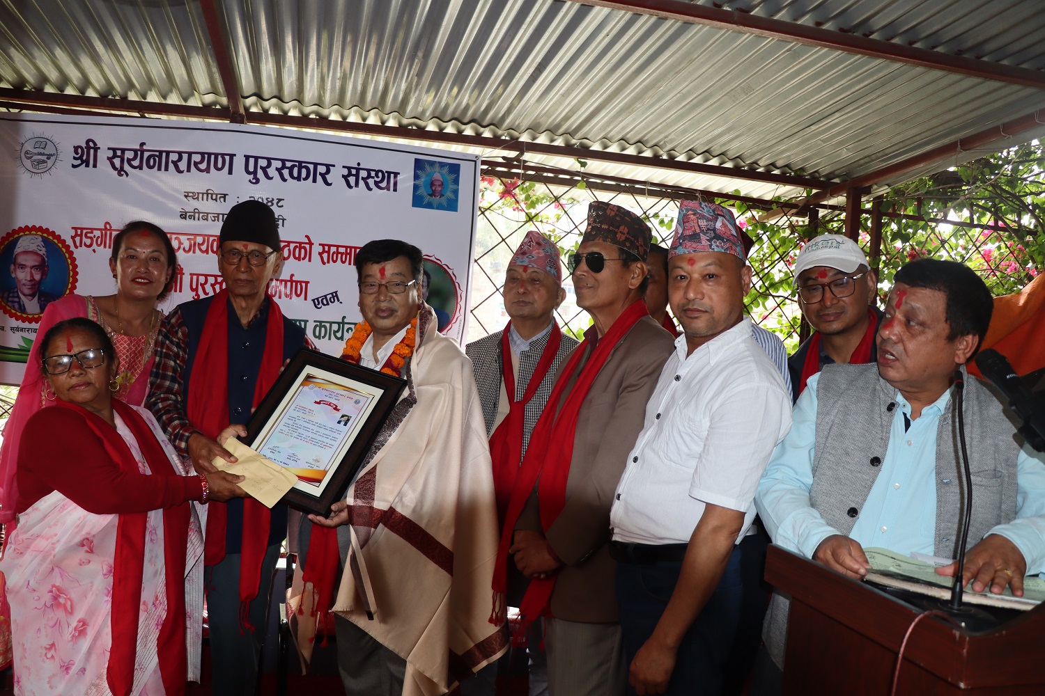 बेनी, ः म्याग्दीका संस्कृतिकर्मी सञ्जयकुमार श्रेष्ठलाई ‘सूर्यनारायण पुरस्कार’ अर्पण गरिएको छ ।