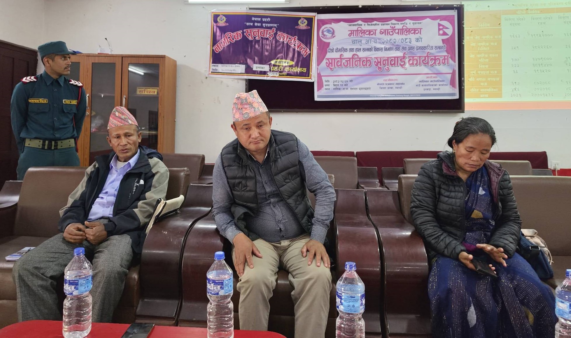 गाउँपालिकाको केन्द्र वडा नम्बर ६ छ्यारछ्यारे स्थित सभाहलमा गाउँपालिकाको आयोजना र नेपाल पत्रकार महासंघ म्याग्दीको सहजिकरणरसमन्वयमा सार्वननिक सुनुवाइ सम्पन्न भएको हो । गाउँपालिकाका प्रमुख प्रशासकीय अधिकृत हरिश्वचन्द्र ढकालले चालु आर्थिक वर्षमा सम्पन्न भएका विकास निर्माण प्रगति, सेवा प्रवाह र उपलब्धी विवरण प्रस्तुत गर्नुभएको थियो ।